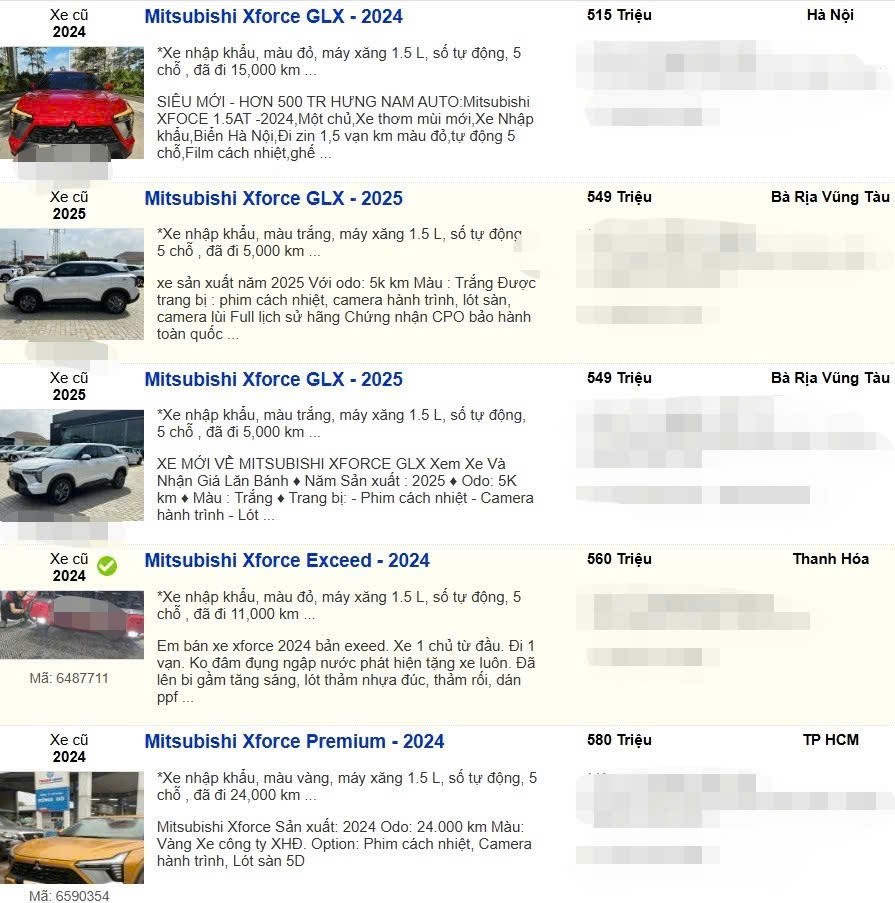 Khảo sát nhanh trên một số nền tảng mua bán xe đã qua sử dụng, Mitsubishi Xforce cũ hiện được chào bán với dải giá khá rộng, tùy phiên bản, năm sản xuất và số km đã lăn bánh. Các xe Xforce GLX sản xuất năm 2024, Odo khoảng 15.000Km, đang được rao quanh mức 515 triệu đồng. Trong khi đó, những xe GLX chạy rất ít khoảng 5.000Km, có giá phổ biến 545 - 549 triệu đồng, gần sát giá xe mới tại đại lý nếu không tính các ưu đãi theo thời điểm.