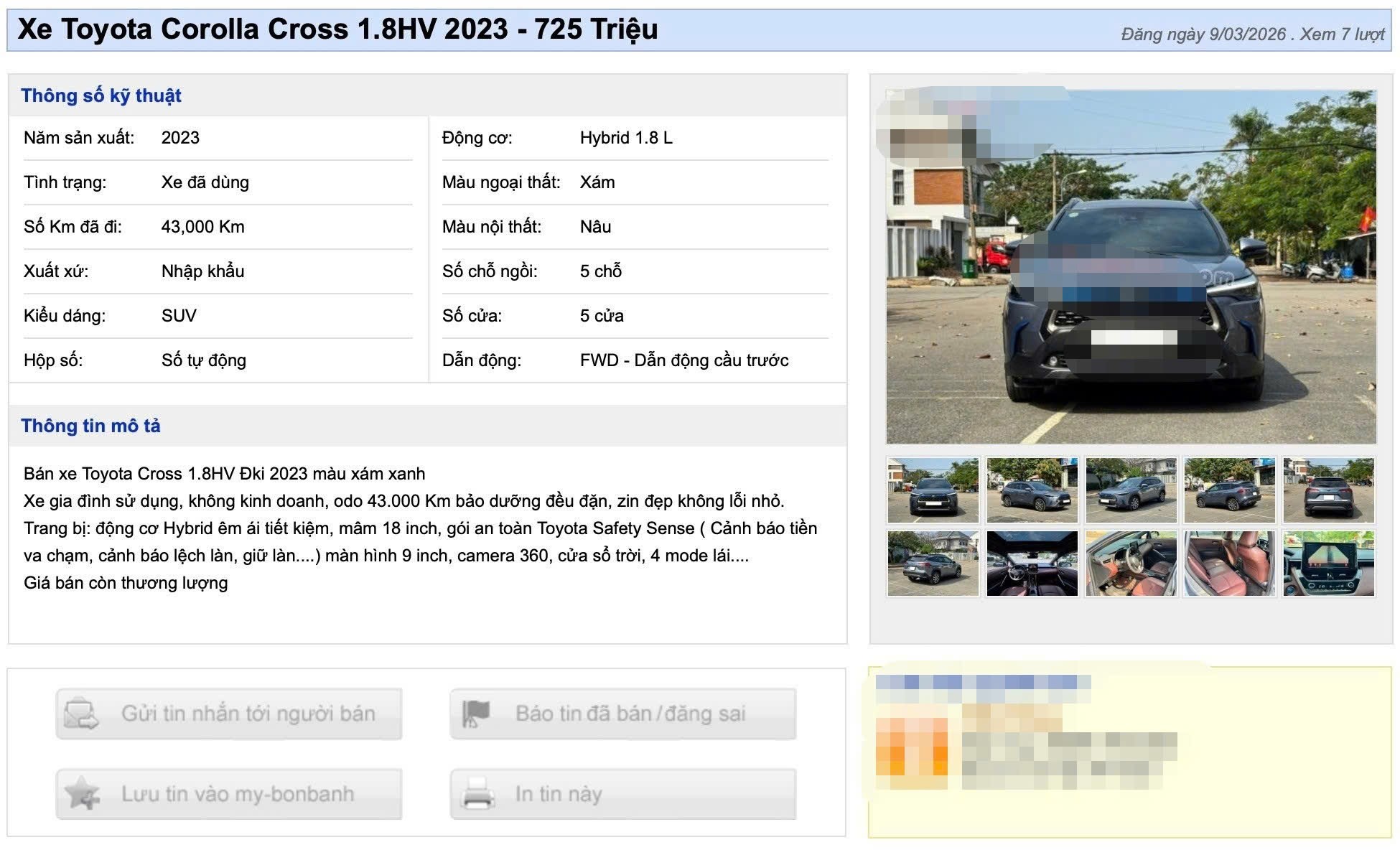 Theo thông tin trong tin rao, xe thuộc đời 2023, sử dụng hệ truyền động hybrid 1.8L, tình trạng đã qua sử dụng với quãng đường khoảng 43.000Km. Xe mang màu ngoại thất xám, nội thất tông nâu, cấu hình 5 chỗ ngồi quen thuộc của dòng Corolla Cross. Người bán cho biết đây là xe gia đình sử dụng, không chạy dịch vụ, được bảo dưỡng định kỳ và giữ ở trạng thái “zin đẹp”. Những yếu tố này thường tạo cảm giác yên tâm hơn cho người tìm xe cũ.